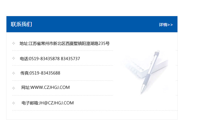地址:常州市新北區友邦商務大廈1幢16、17層  電話:0519-85101652  傳真:0519-85112595  郵編:213022  網址:www.cz-jiayue_cn.szjingen.com  郵箱:xiajifengaa@163.com